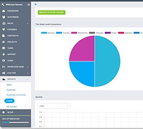 Generate reports and have clear view of everything. Keep track of income vs. expenses and leads conversions. Knowledge base report included.